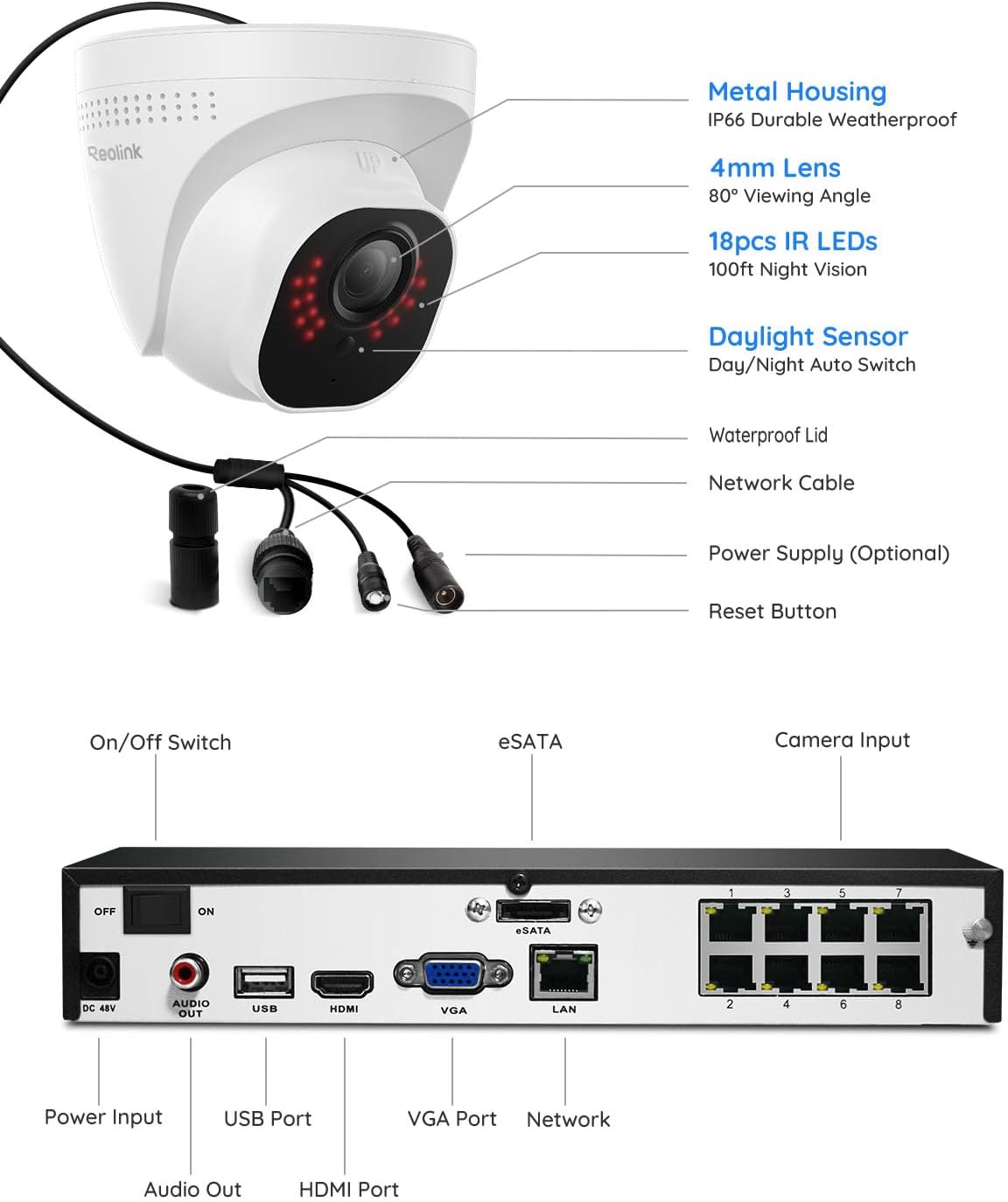 - HDD Storage and Remote Playback – Including a pre-installed 2TB HDD, videos can be recorded and stored for ten days without overwriting occurring. Users can add one additional external 6TB HDD via the camera’s e-SATA port. With the free Reolink app, all videos can be played back through your smart device anywhere, anytime.