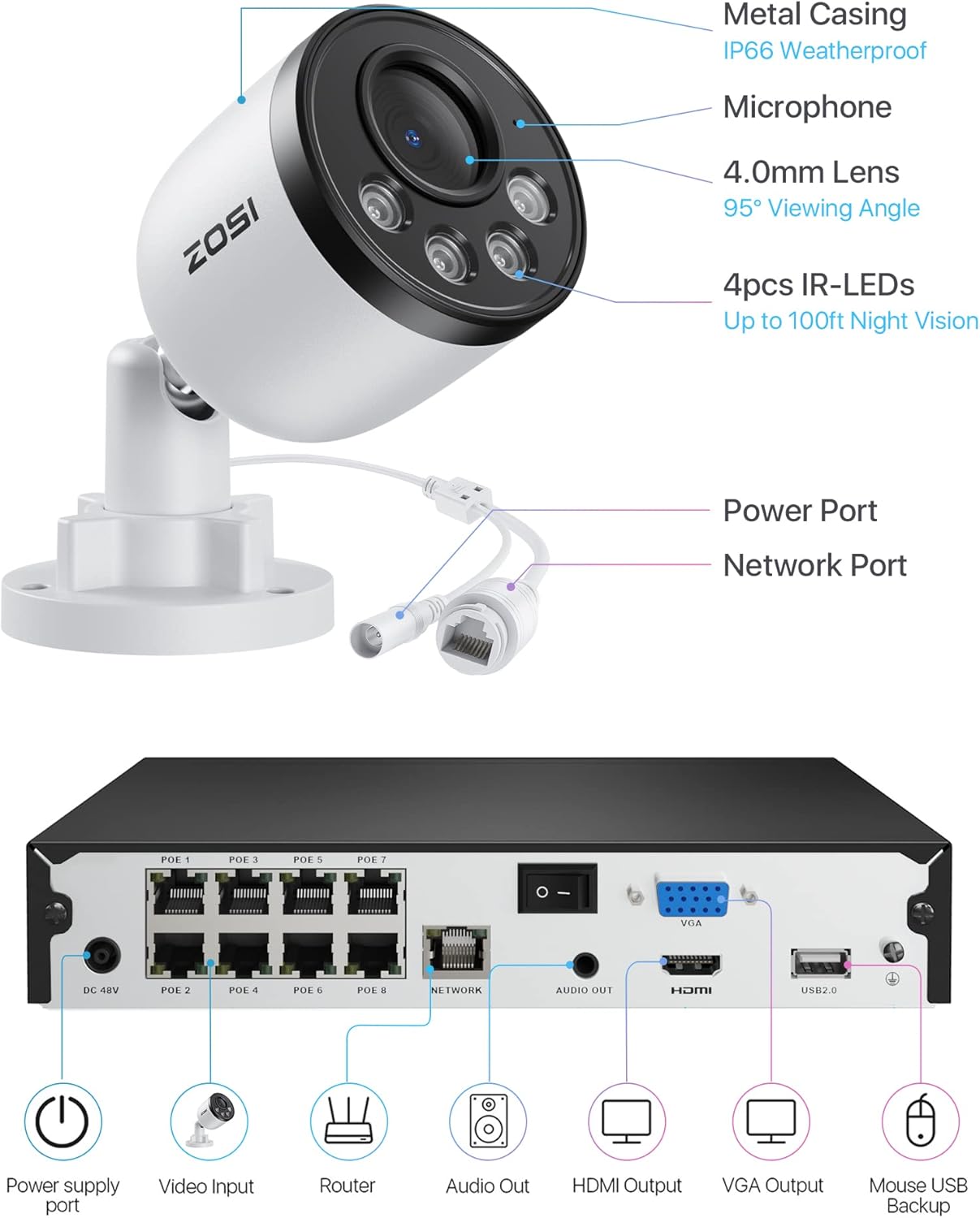 ZOSI 5MP 8CH PoE Security Camera System with Audio, 4pcs Outdoor PoE Cameras