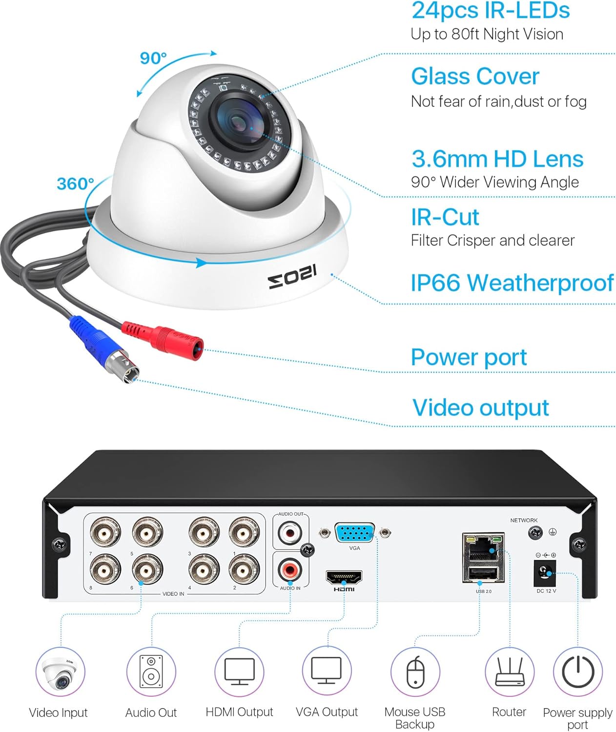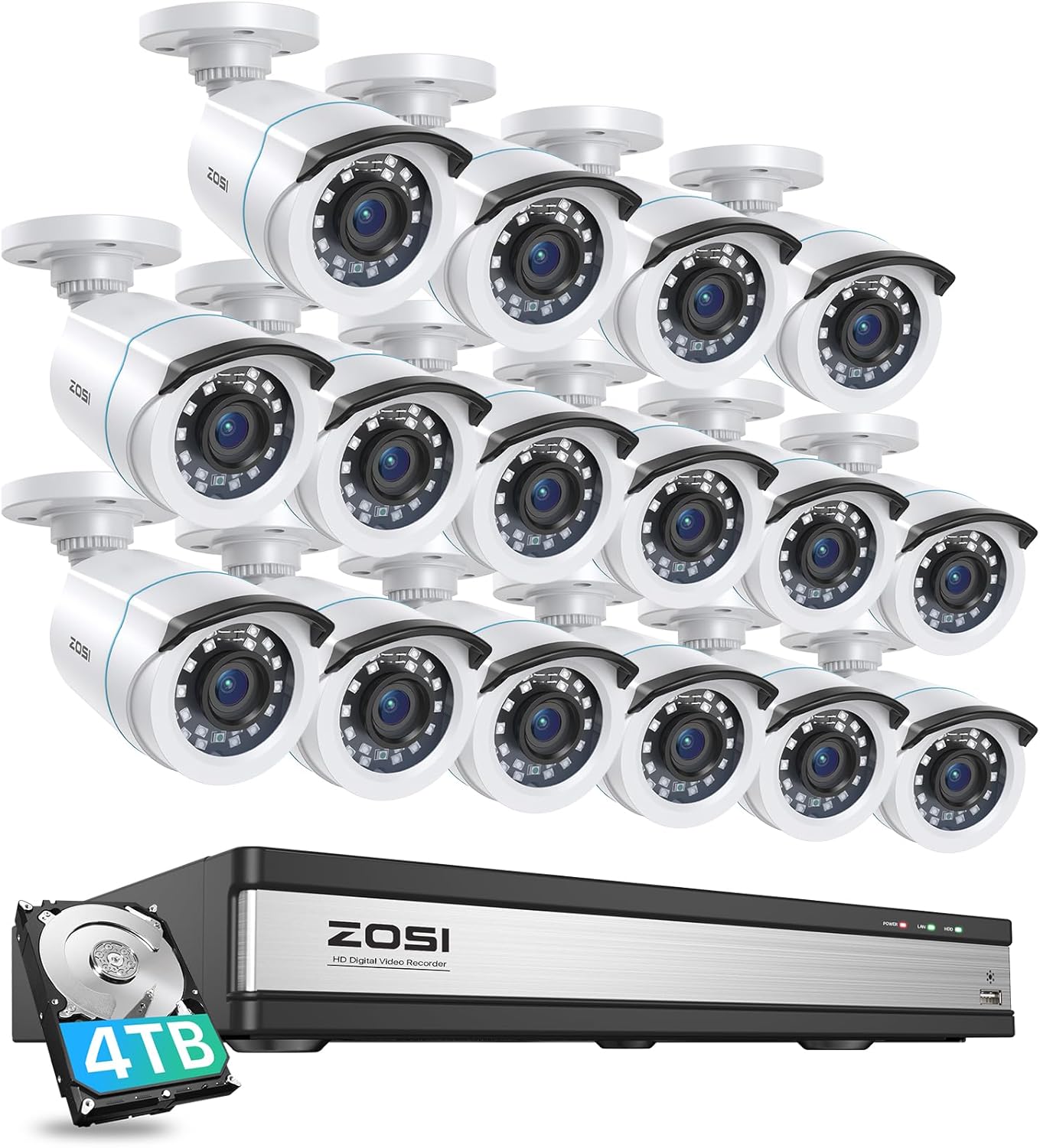 - (2). [ 2MP 16CH CCTV System Overview ] __ Experience the power of an exclusive H.265+ 16-channel 1080p DVR recorder paired with 16 weatherproof 1080p bullet cameras, providing 80ft night vision and a 90° viewing angle. The BNC+DC CCTV cabling delivers both video and power, offering a more stable and reliable connection than wireless systems. (Includes 4TB security-grade hard drive).